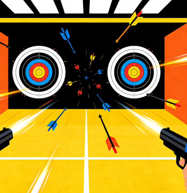 Gameplay: Quick-draw aiming, instantaneous target appearance, and combo mechanics.